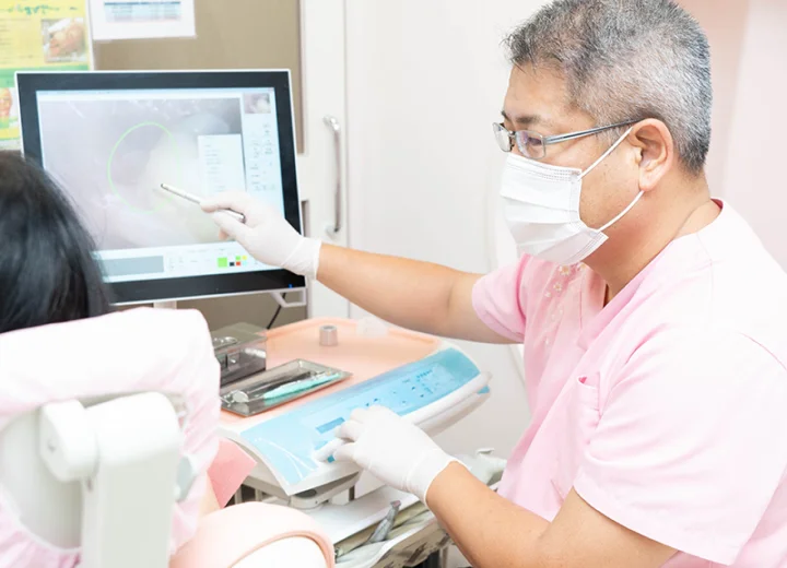 当院では、症状や検査結果、治療内容についてご説明する際、説明用ツールを活用し、できるだけわかりやすい言葉でお伝えすることを大切にしています。各診療チェアには大型モニターを設置しており、検査画像や治療方法を紹介するイラストなどを鮮明な映像でご確認いただけます。内容をしっかりご理解いただいたうえで、安心して治療に臨んでいただける環境を整えています。